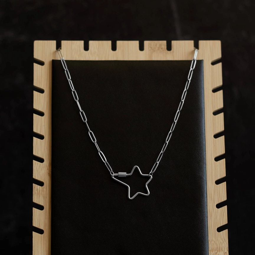 Halskette von That Queer Card Co aus Besançon (Frankreich). Der Karabiner ist voll funktionsfähig und dient als Verschluss der Halskette. Die Kette ist aus Edelstahl gefertigt und daher robust, anlaufbeständig, kratzfest und korrosionsbeständig. Verpackt auf einer schwarzen Kartonrückseite.