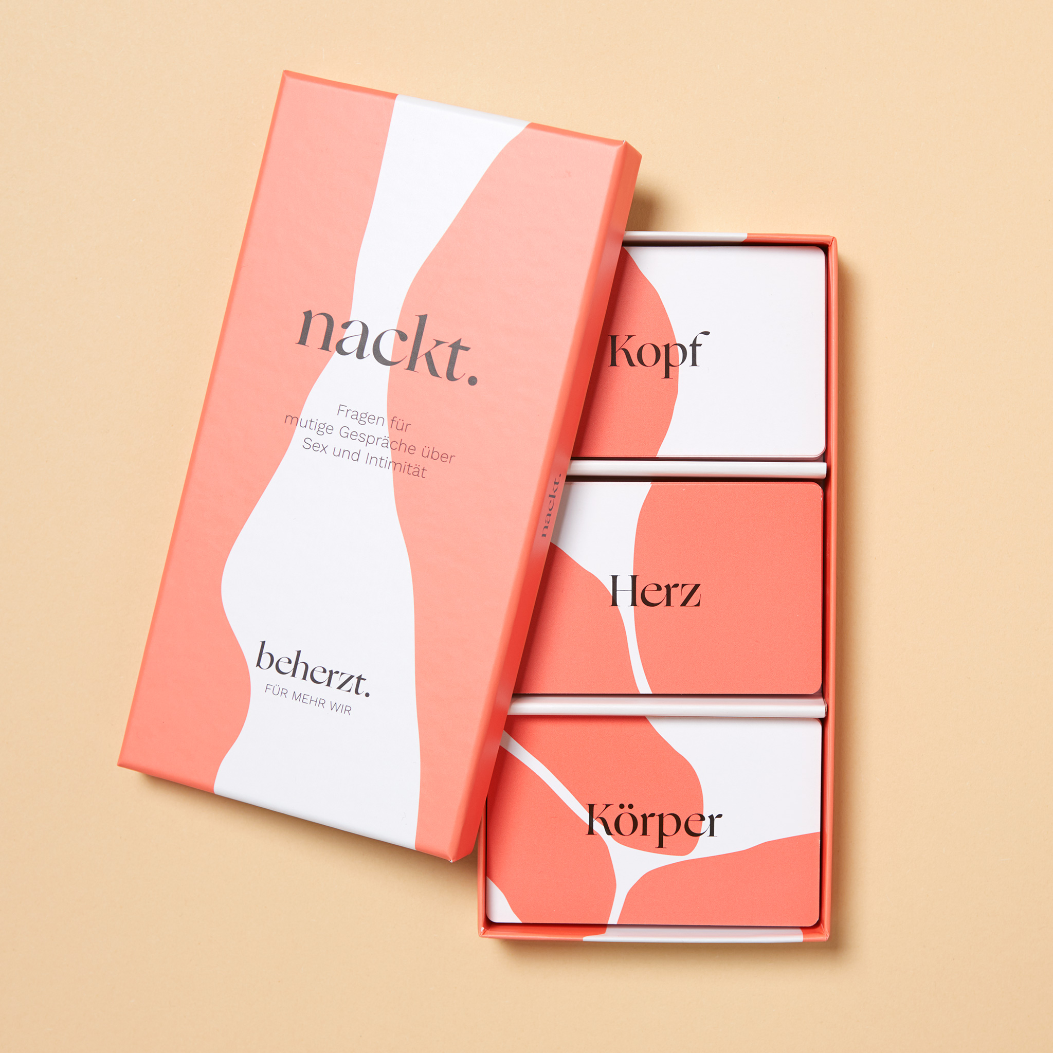 Nackt. ist ein Anreiz, sich näher zu kommen – im Dialog und unter der Decke. Der neueste Zuwachs in der Familie beherzt. umfasst 90 Fragen für Frischverliebte und Langverheiratete, für queere Liebende, alte Bettbekannte und Friends with Benefits – kurzum für alle Menschen, die miteinander schlafen. Das Kartenset wurde mit Sexolog*innen entwickelt und regt zum mutigen Gespräch über Sex und Intimität, Erfahrungen und Bedürfnisse an.