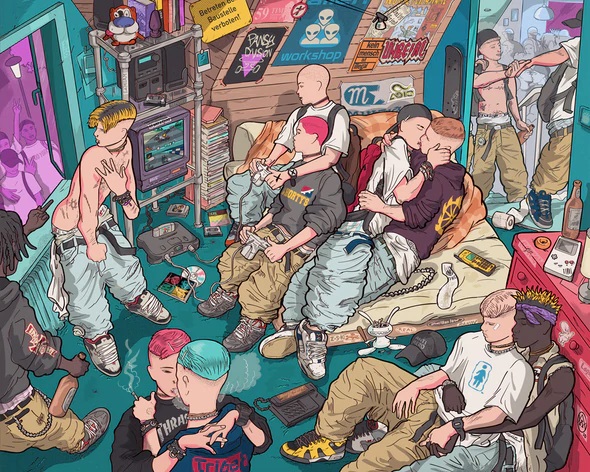 About Andy Warlord: A comic artist living in Berlin. He studied illustration in Germany & New York. His comics introduce new alternative fetish characters in their „uniforms“ to a fetish scene that is obsessed with police and military gear. His artwork is an unapologetic display of deviant fetishes and a celebration of utopian comradery between queers.