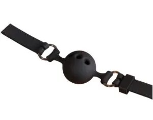 Schwarzer Knebel mit Luftlöchern fürs enstspannteres Atmen und verstellbarem Riemen. Wird hinten am Kopf mit einer Schließe geschlossen. Reibt die Mundwinkel nicht auf. Kann einfach gereinigt werden.